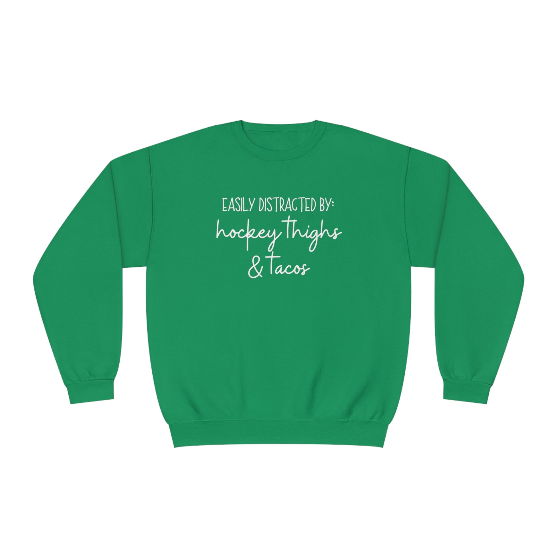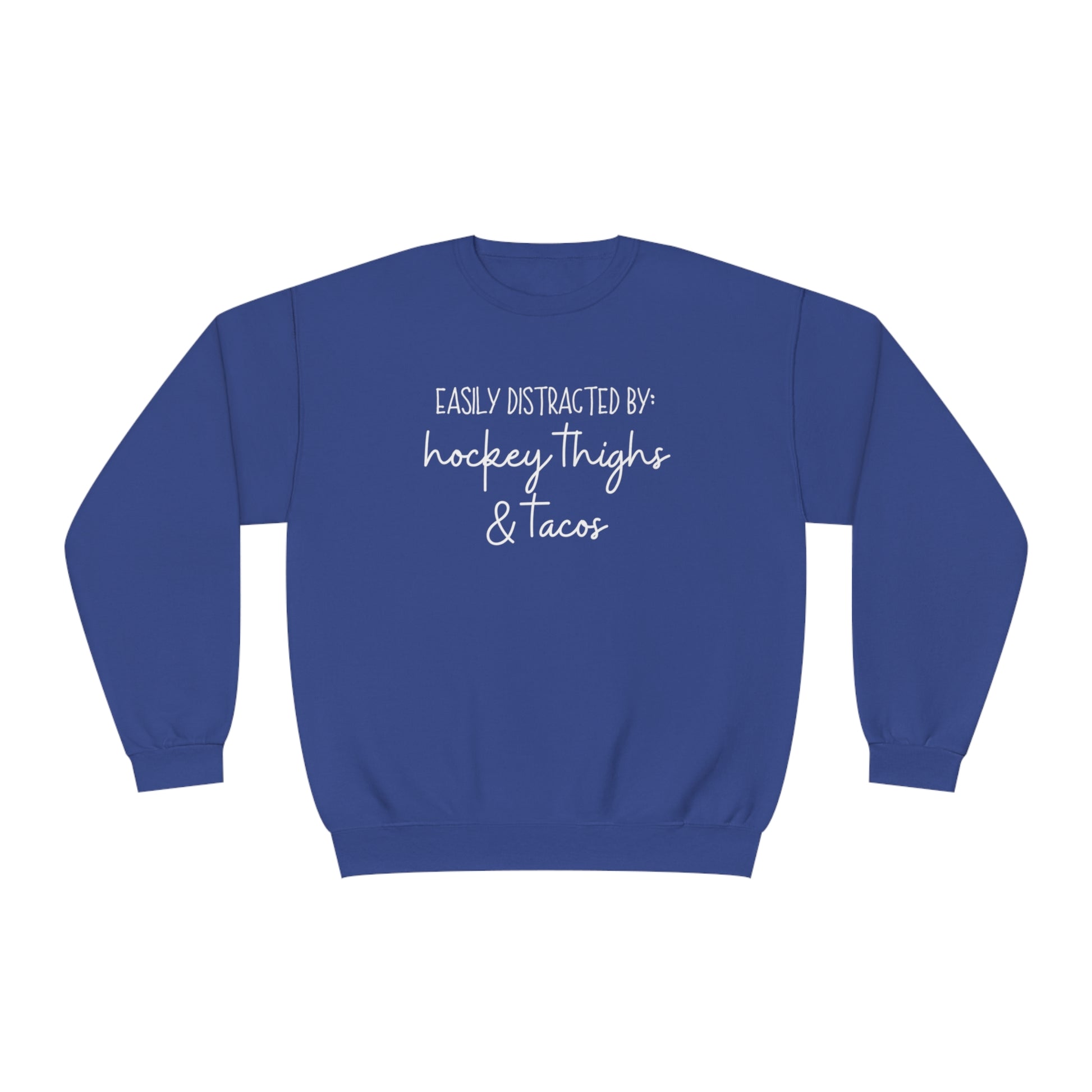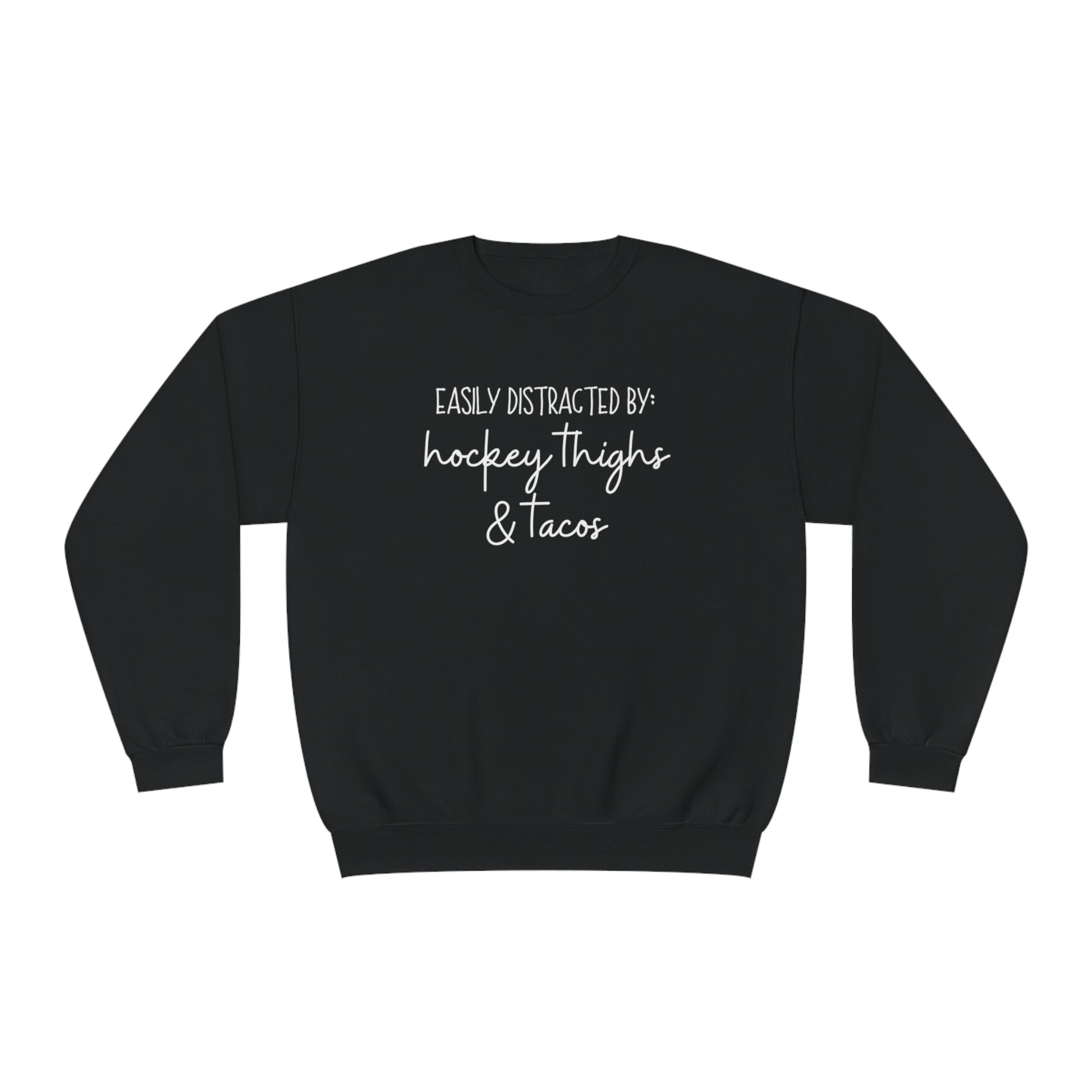 Easily Distracted by: Hockey Thighs and Tacos Unisex Jerzees Crewneck Sweatshirt